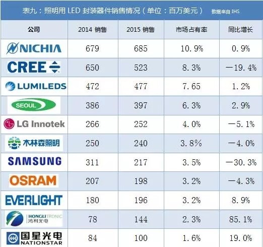 在規(guī)模致勝的中上游產(chǎn)業(yè)中,預(yù)測未來國內(nèi)上游的外延芯片企業(yè)通過兼并重組和自然淘汰僅剩十家左右;國內(nèi)中游封裝情況類似,低產(chǎn)能將導(dǎo)致高成本,小規(guī)模企業(yè)將無以生存,余二十家左右;從表九中可以看出,僅就照明用LED封裝器件來說,國內(nèi)封裝企業(yè)增長態(tài)勢強勁,這也和國內(nèi)照明應(yīng)用企業(yè)數(shù)量龐大不無關(guān)系。