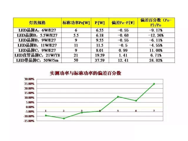 LED燈的標(biāo)稱(chēng)功率與實(shí)際測(cè)量的功率均有不同程度的偏差,正負(fù)誤差均有,最大偏差近25%,非常離譜。