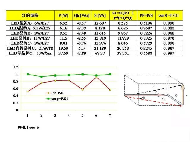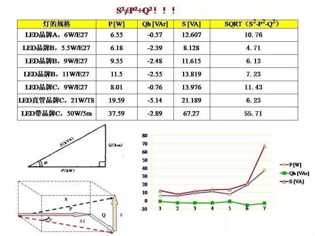 正常情況下,有功功率P、無(wú)功功率Q、視在功率S滿(mǎn)足勾股弦定律。但從上圖最后一列可以看出,P、Q、S不滿(mǎn)足此規(guī)律,多出的部分表明LED燈存在第三種功率D。事實(shí)上,P、Q、D、S滿(mǎn)足長(zhǎng)方體法則,即P、Q、D分別是長(zhǎng)方體的長(zhǎng)、寬、高,S是長(zhǎng)方體的對(duì)角線(xiàn)(見(jiàn)上圖左下角)。