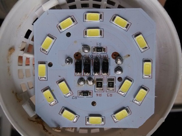 LED燈板。很容易看到,LED就是橋式整流驅(qū)動(dòng)的,沒(méi)有驅(qū)動(dòng)IC。