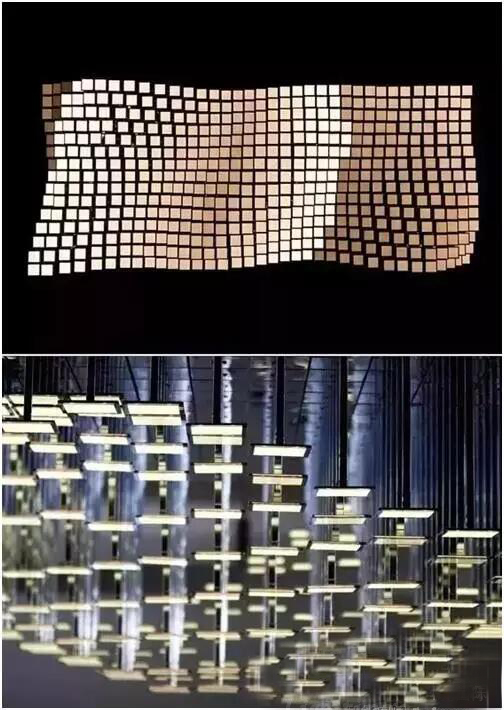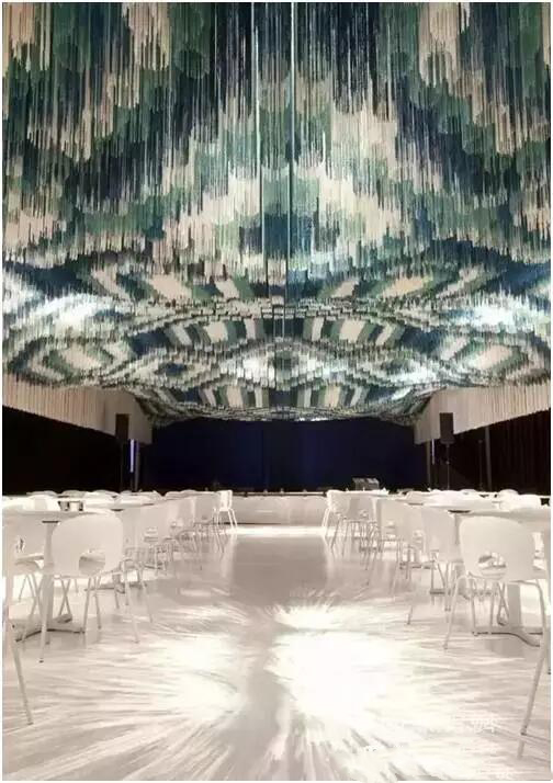 “萬燈壓頂”的最高境界,恐怕就是這個(gè)地毯式的天花照明了。這個(gè)壯觀無比的掛在天上的“地毯”來自美國(guó)華盛頓特區(qū)肯尼迪中心的季風(fēng)俱樂部。這個(gè)燈的排列配色,可要比我們見到的水晶燈復(fù)雜多了,而其波浪起伏則以懸掛的玻璃細(xì)線的長(zhǎng)度來控制,最終完整地展現(xiàn)了一幅夢(mèng)幻般效果的畫卷,將現(xiàn)代和古典完美融合。