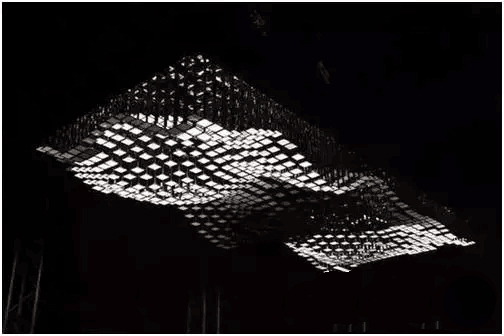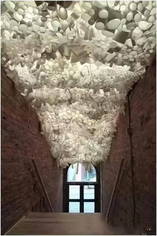 在一個(gè)藝術(shù)中心的主樓梯入口,藝術(shù)家Alicia Basinger利用整個(gè)天花板空間,安裝了成千上萬的不同大小的白色圓柱體,這一過程類似于混亂的徒手建造蜂巢。這些大小不同、混亂的蜂巢里面正好成了“儲(chǔ)光”的工具,讓人一進(jìn)入眼睛就被狠狠的撞擊了。