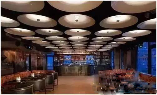 用燈具鋪滿天花,是不是就代表繁瑣?未必如此,這個(gè)酒吧的頂部幾乎用了圓形的吊燈進(jìn)行裝飾,反倒讓人有舒適,甚至秩序感。這樣的布光,總讓人第一時(shí)間想起了阿爾托,他的圓筒形引導(dǎo)天光進(jìn)入室內(nèi)的處理光的方式,無形中影響了很多設(shè)計(jì)師。