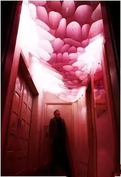 無論是酒店、還是家庭,都一直被告誡,一定要慎用曖昧不清的紅色、枚紅色的光,搞不好就會(huì)有廉價(jià)、低俗之感。但是,總有高手能讓“禁色”也變得出眾,更何況是這樣大面積使用在過道天花上。枚紅色的花瓣造型充當(dāng)了燈罩,透光、濾光后,為天花營(yíng)造了深淺不一,起起伏伏的紅色花海。