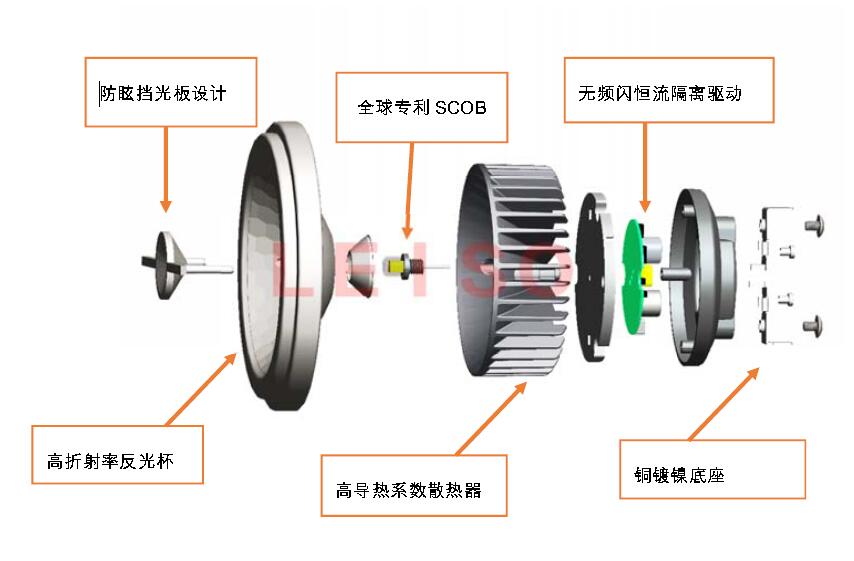 在工程方面,往往電源驅(qū)動(dòng)和散熱是最為重要的方面。不穩(wěn)定的電源,能夠大大減少LED燈泡的壽命,說1W 5小時(shí),其實(shí)可能只有數(shù)百;散熱同樣至關(guān)重要,散熱不好發(fā)光衰減嚴(yán)重,沒用多久就覺得不那么亮了,也是減少使用壽命。下面讓我們用一張LEISO萊碩照明產(chǎn)品的爆炸圖簡(jiǎn)單了解一下他的內(nèi)部結(jié)構(gòu):