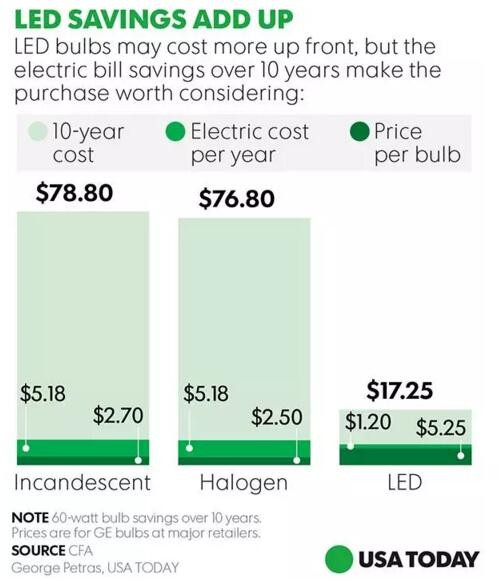 例如,對60瓦的不可調(diào)光燈泡進行的調(diào)查發(fā)現(xiàn),LED的平均10年成本為13.70美元,而白熾燈和鹵素?zé)舻钠骄?0年成本為69.49美元。由于家庭平均使用20多個燈泡,因此消費者現(xiàn)在依賴于白熾燈和鹵素?zé)?,可以通過切換到LED來節(jié)省1000多美元。