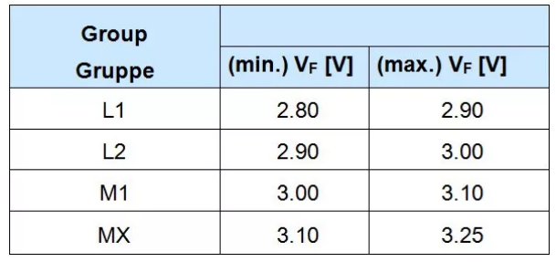 例如,工程師選用 OSRAM LCW CRDD 系列燈珠(Vf BIN 表如下)12 顆設(shè)計(jì)中心值為 36V 的燈串。