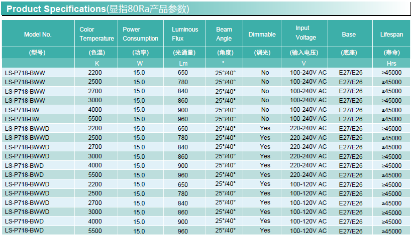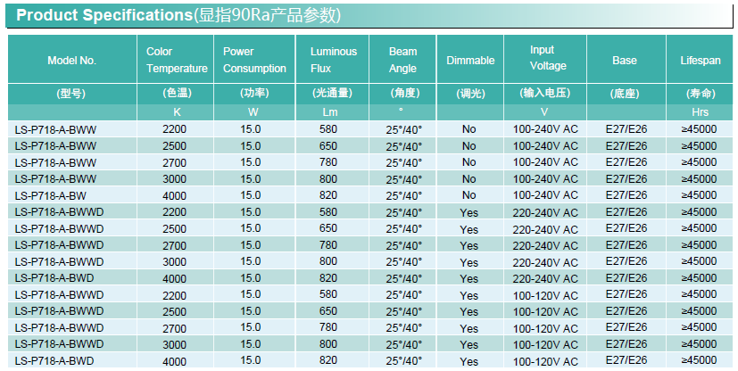 底座 —— E26/E27 額定壽命(小時(shí)) —— 45,000hr